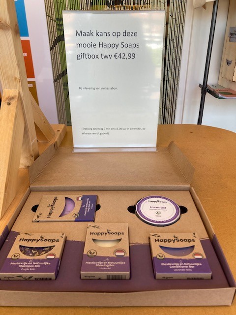 Ter gelegenheid van ons 40-jarig bestaan hebben we van Happy Soaps een mooie geschenkdoos gehad om te verloten onder onze klanten. Iedereen die tot 7 mei iets koopt, kan zijn kassabon achterlaten. (Op verzoek kan een tweede bon uitgeprint worden.). Achterop de bon schrijf je, je naam en je telefoonnummer. Op zaterdag 7 mei om 16.00 uur wordt uit de ingeleverde kassabonnen de winnaar getrokken. Deze wordt daarna meteen gebeld.