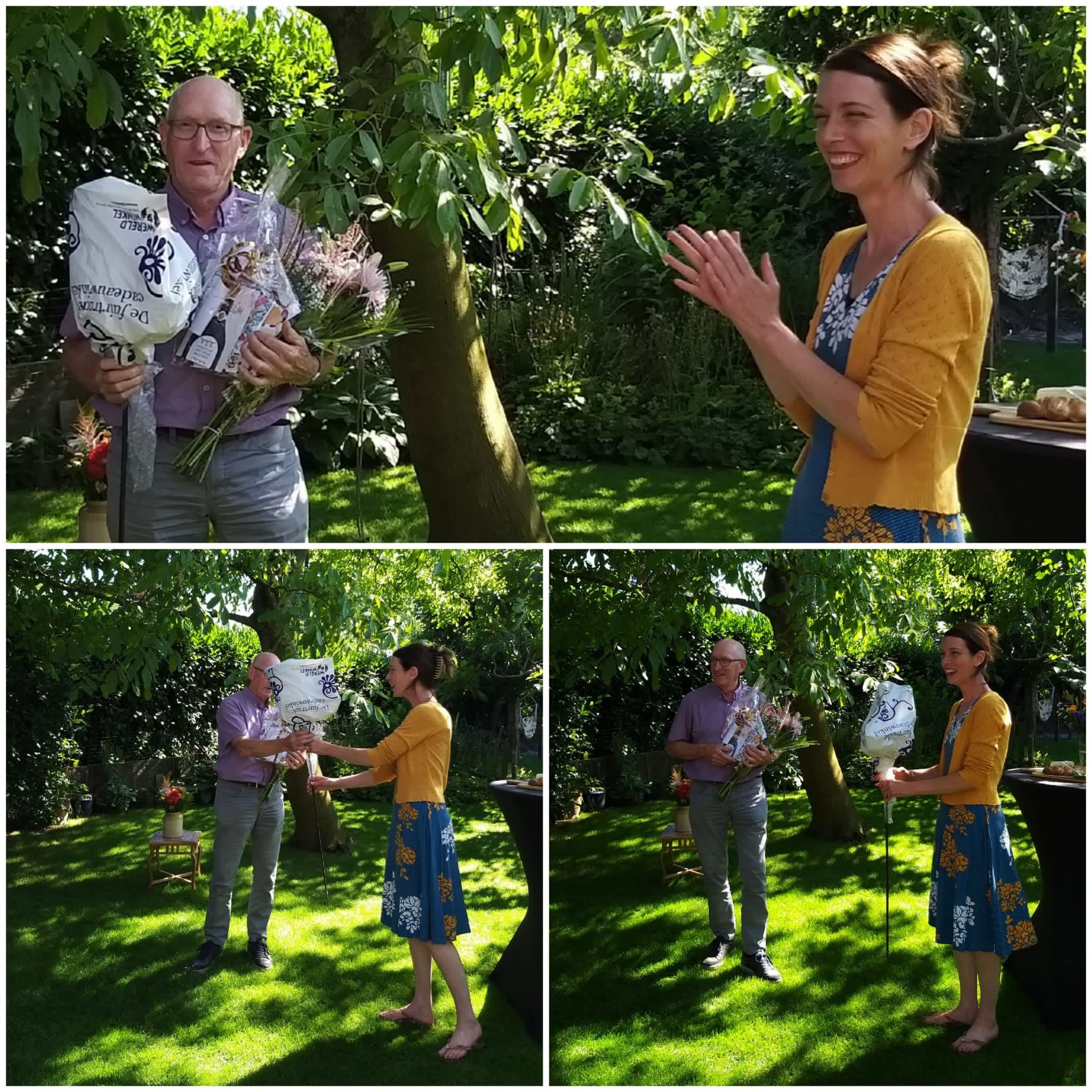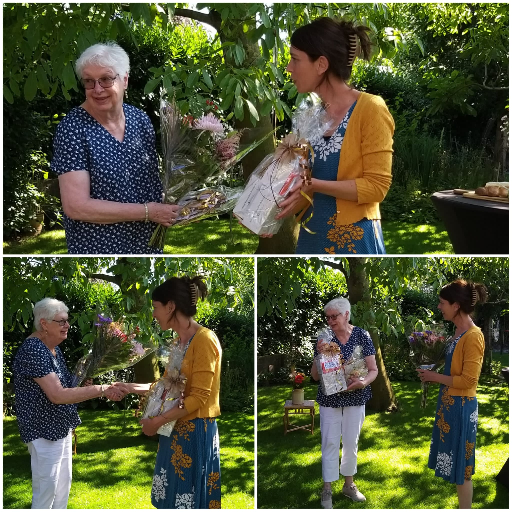 De jubilarissen ontvingen uit handen van voorzitter Danielle Ternatus een mooie bos bloemen, een leuke attentie en een slinger met gelukswensen van alle collega's.