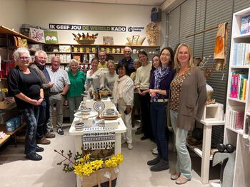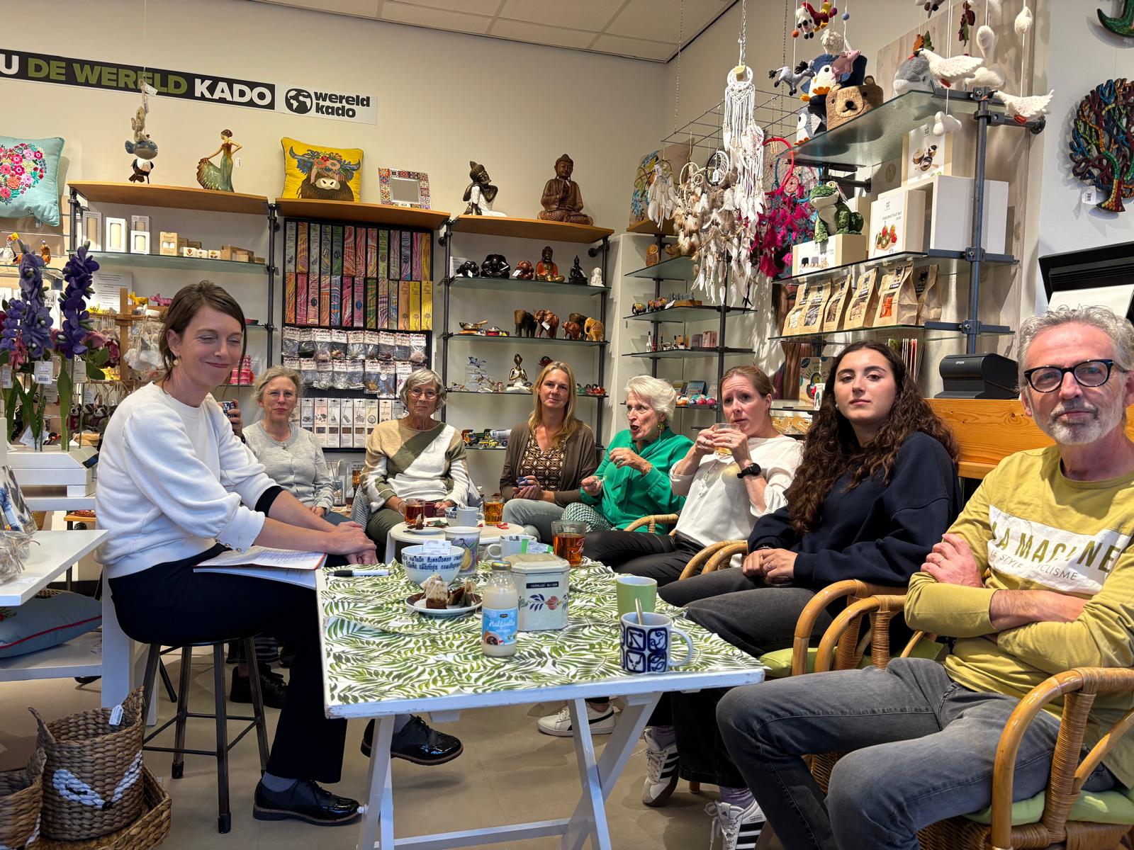 Winkelcoördinator Sandra gaf uitleg over hoe de inkoop werkt en hoe we weten dat de makers van de artikelen een eerlijke prijs krijgen. Onze gasten waren nieuwsgierig en kwamen met veel vragen én mooie ideeën zoals: een inpakcursus voor de feestdagen, spreekbeurten door basisschoolkinderen en ludieke manieren om jongere klanten te bereiken.