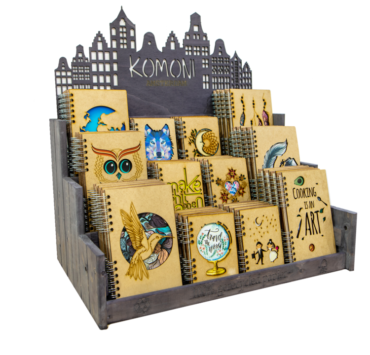 We verkopen ook duurzame notitieboekjes van het merk Komoni. De boekjes komen uit Mexico met een een houten uitgesneden kaft. Ze zijn in twee formaten verkrijgbaar en in diverse uitsnedes.